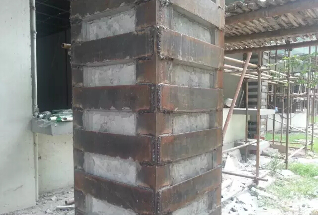 该法是在构件外围包以型钢的加固方法, 具体可分为湿式外包钢加固法和干式外包钢加固法。一般用于混凝土柱、梁、屋架,特别是大型结构和大跨度结构的加固。其中湿法是指型钢与构件通过乳胶水泥、环氧树脂等粘结剂与原构件粘结, 新加型钢与原构件形成整体共同工作; 干法指新加型钢与原构件之间不采用粘结剂粘结, 不能保证结合面剪力的有效传递。在抗震加固中一般采用湿式外包钢加固法。适用于加固钢筋混凝土梁、柱及砖柱、砖烟囱等,但对于圆形和曲面构件加固工艺则相对复杂。它具有施工方便,现场工作量少,能有效提高构件抗震性能的优点, 其优点是施工方便,现场工作量少,受力可靠。缺点是用钢量较大,加固维修费用较高。当采用化学灌浆外包钢加固时,型钢表面温度不应超过六十度;当环境具有腐蚀性介质时,应有可靠的防护措施。